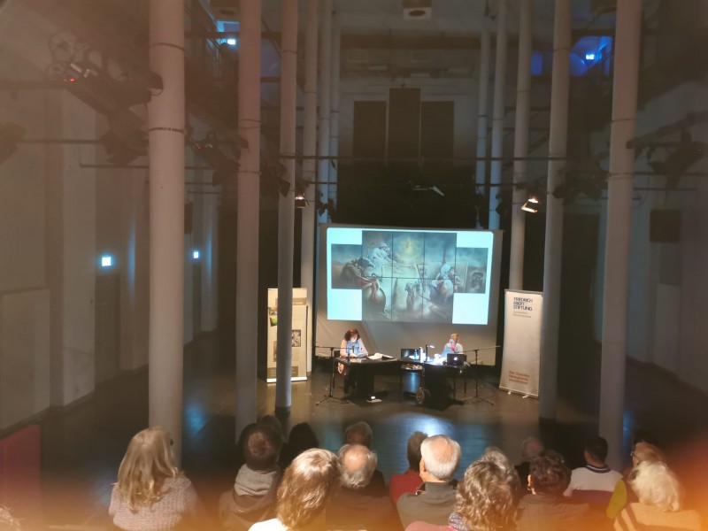 Diesmal hatten wir es nicht weit: Am Freitag, 1.Dezember 2023, 18:30 - 21:00 Uhr, hatte die Friedrich Ebert Stiftung (FES) das Alte Magazin, Kestnerstr. 18 in Hannover für uns reserviert. Nach einer ausführlichen Begrüßung durch die Referentin im Landesbüro Niedersachsen, Linda Matzke, sprach die Kooperationspartnerin "Netzwerk Migrantinnen und Arbeitsmarkt Niedersachsen" (NeMiA), vertreten durch die Leiterin Naciye Celebi-Baktas, begrüßende Worte. Schon in der Pause zeigte sich, dass unser Auditorium am liebsten weiter zuhören wollte, die meisten blieben sitzen. Sie warteten auf den spannenden 2. Teil in dem