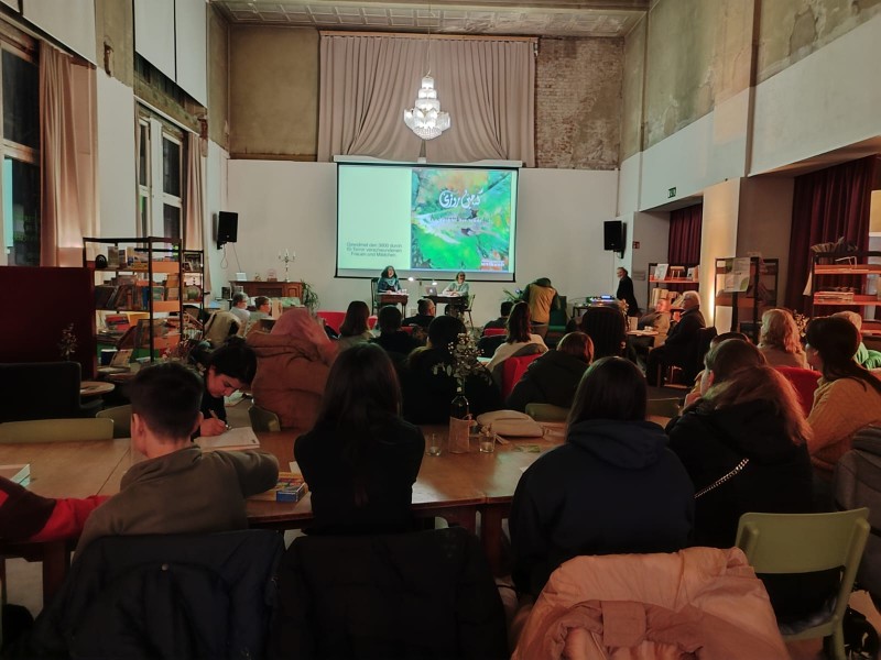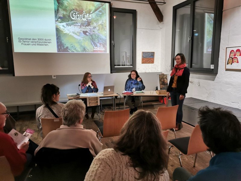 Vor einem hochkompetenten und -interessierten Publikum durften wir am 3. Juni nachmittags aus unserem Buch „Keçên Rojê - Töchter der Sonne, geflüchtete êzîdische Frauen erzählen“ lesen und berichten. Besonders die Gemälde des êzîdischen Malers Ravo Ossman Shingali beeindruckten die Zuhörerinnen durch ihre verborgenen Inhalte. Nach der Lesung entspannten sich lebhafte